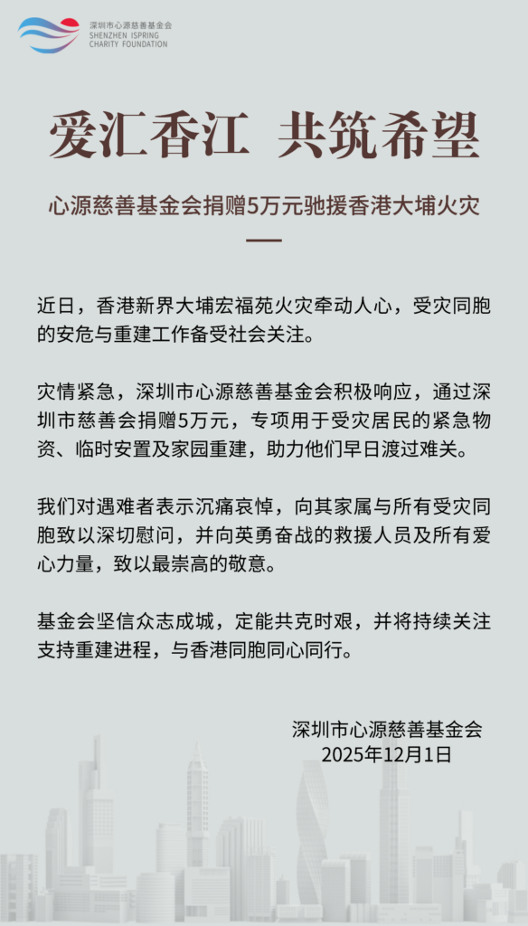 深圳市心源慈善基金会捐赠5万元驰援香港大埔火灾